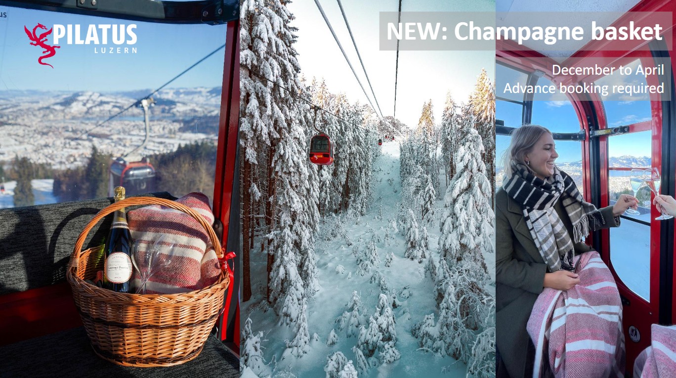 Champagne Gondola Ride นั่งกระเช้าห่มผ้าอุ่น จิบแชมเปญ ท่ามกลางวิวทะเลสาบลูเซิร์นและยอดเขากว่า 70 ยอด หรือเลือก พักค้างคืนบนยอดเขา ชมพระอาทิตย์ตก-ขึ้น และท้องฟ้ายามค่ำคืนที่ความสูง 2,132 เมตร