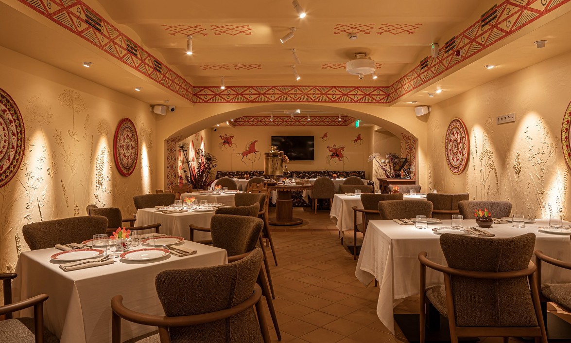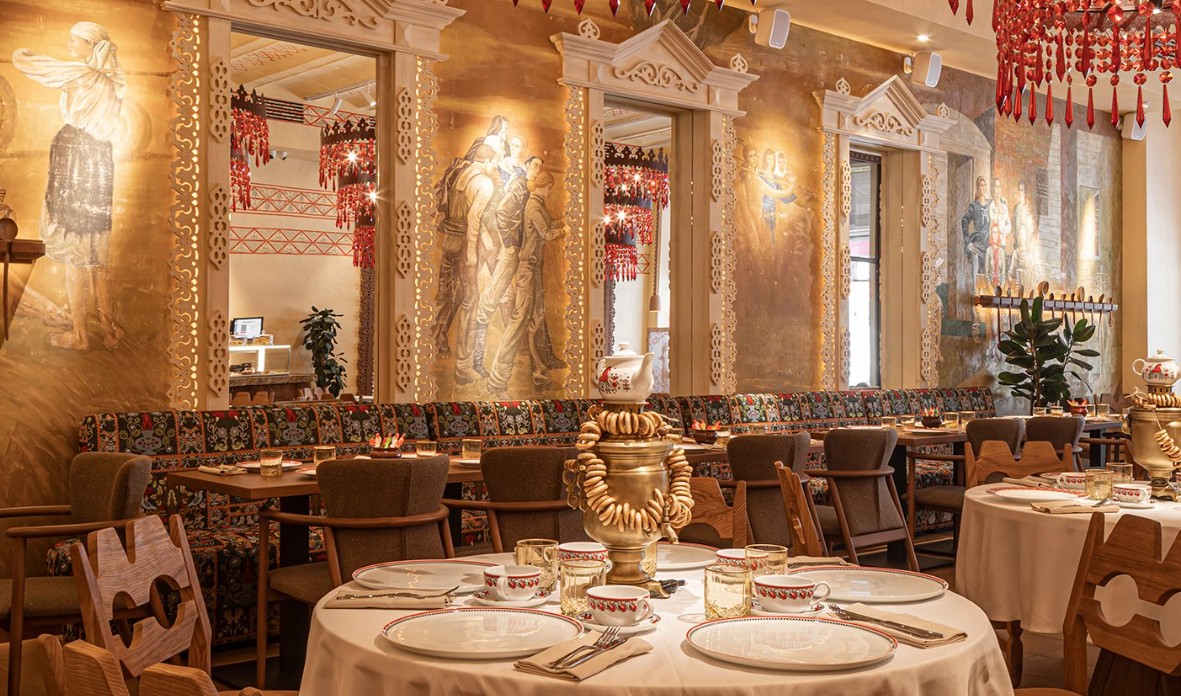 ภายในโถงหลักของร้านมี เตารัสเซียแบบดั้งเดิมและเตาย่างไฟเปิด ที่ใช้ปรุงอาหารต่อหน้าลูกค้า เพิ่มเสน่ห์และความมีชีวิตชีวาให้กับบรรยากาศการรับประทานอาหาร